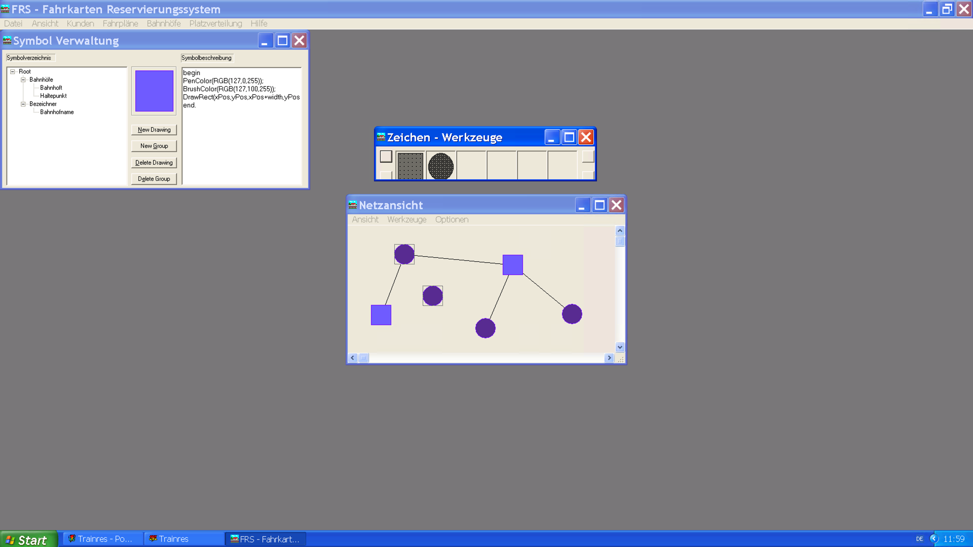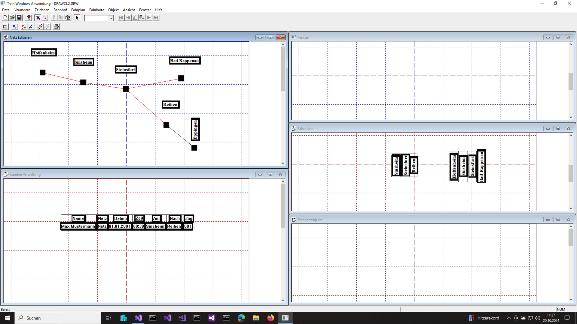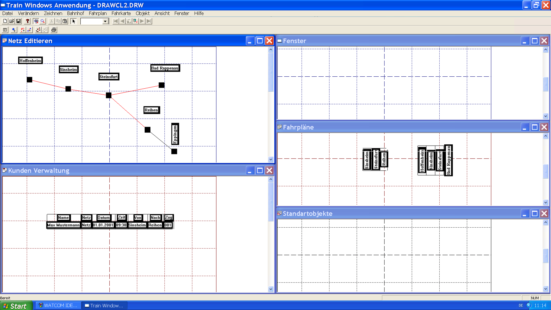 Also the plan was to use that graphical presentation to store data within. As you see a customer was entered into the bottom left window to have been registered for the train ride 001. All made with data structures and the help of the basics of Drawcli.